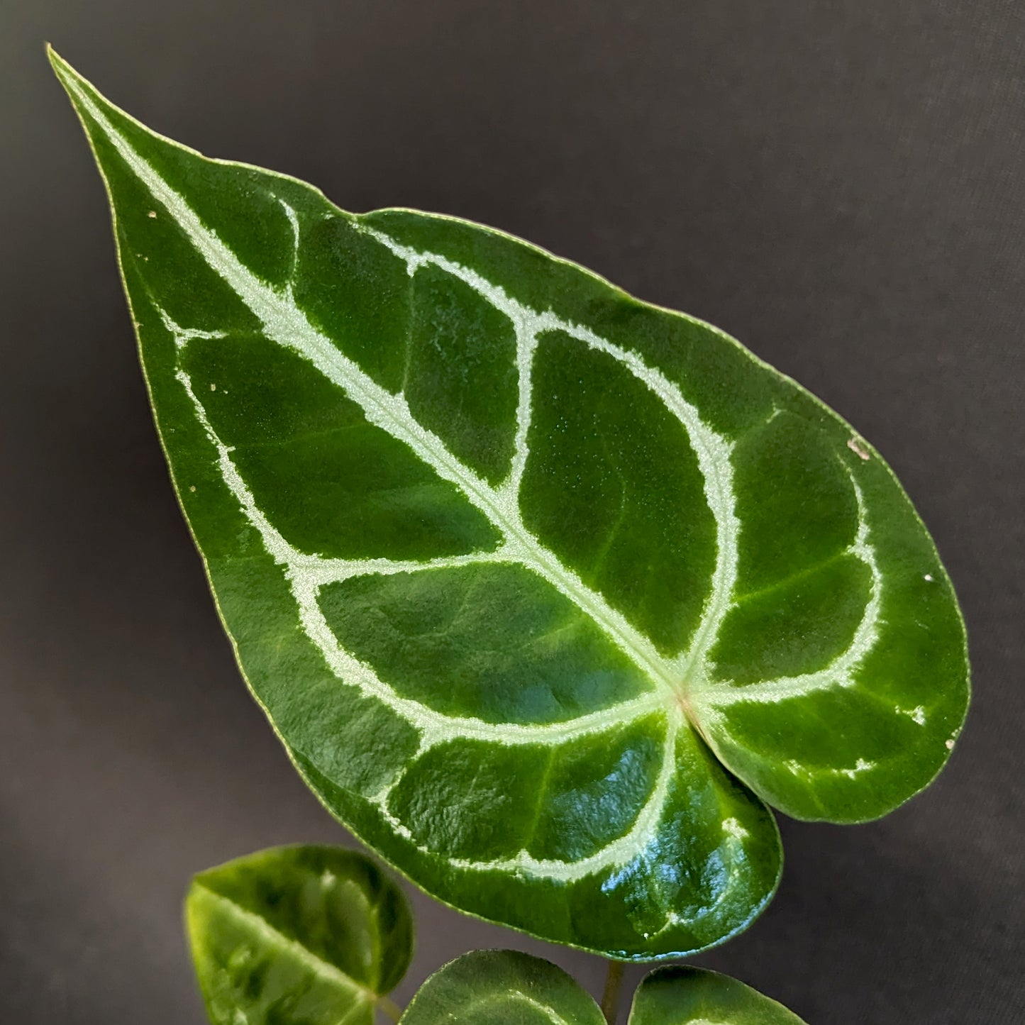 Anthurium forgetii x crystallinum often display the elongated, heart-shaped form of Anthurium forgetii, with its characteristic velvety texture and prominent veining. The leaves may also showcase the glossy, dark green coloration and intricate silver veining of Anthurium crystallinum, adding to their allure.