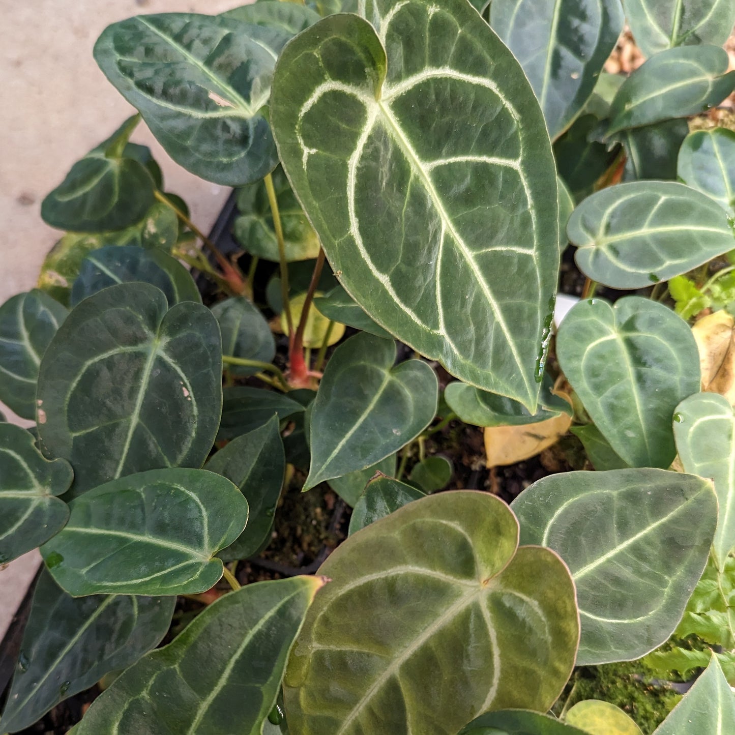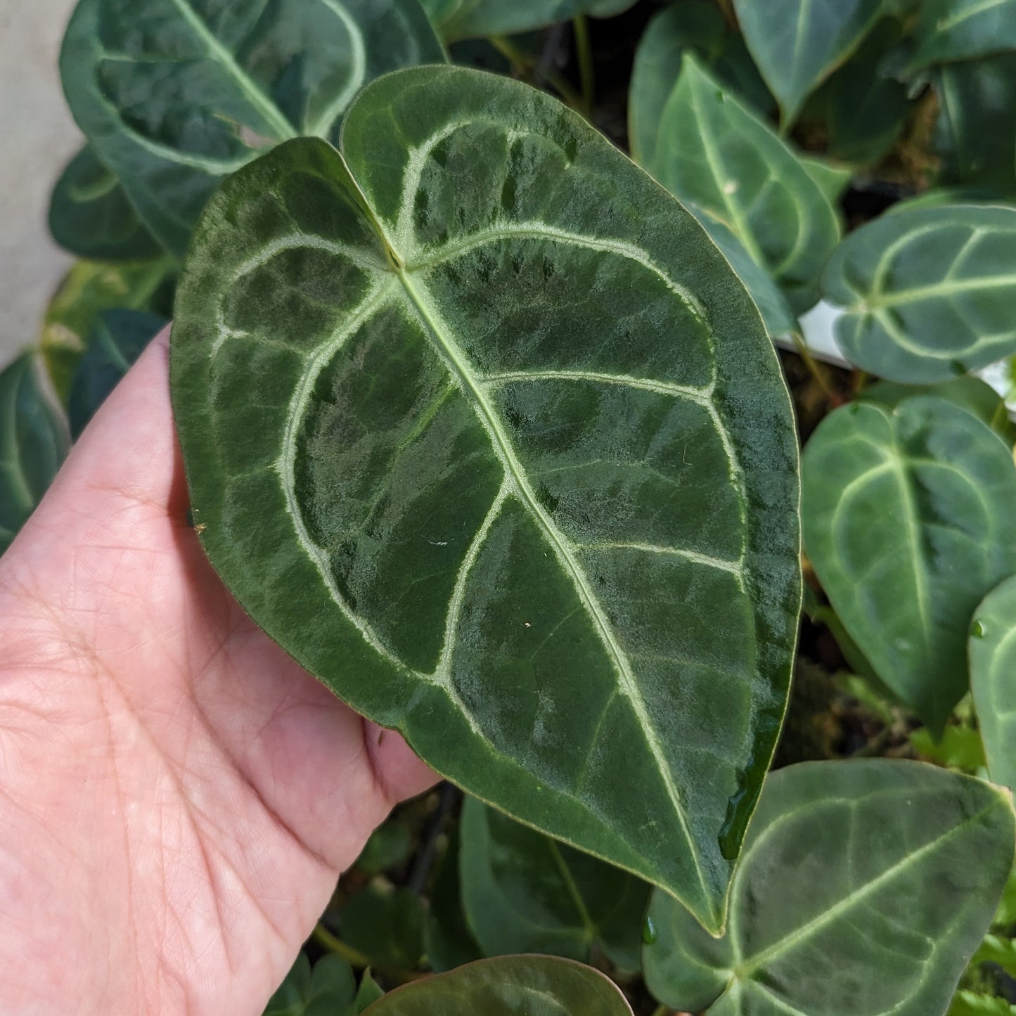 !Anthurium magnificum x regale exhibit an exquisite appearance, often showcasing the elongated, heart-shaped form of regale and the velvety texture and prominent veining of magnificum. With its captivating foliage and unique growth habit, this hybrid is sure to capture the attention of plant enthusiasts, adding a touch of elegance and beauty to any indoor or tropical setting. This rare plant hybrid was bred with the show winner Anthurium regale from the Texas Aroid Show in 2023!
