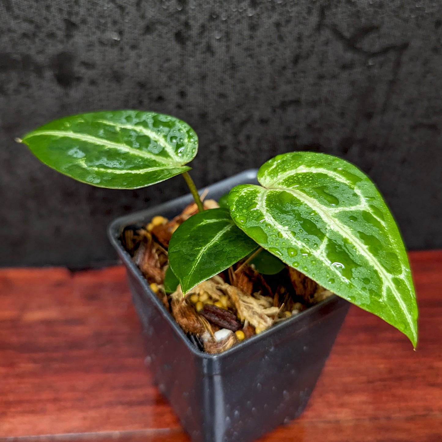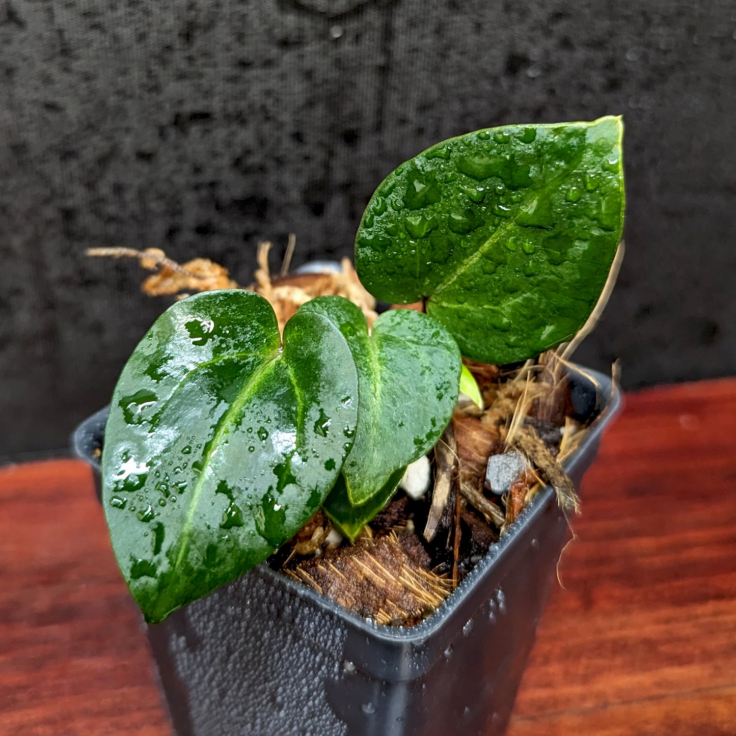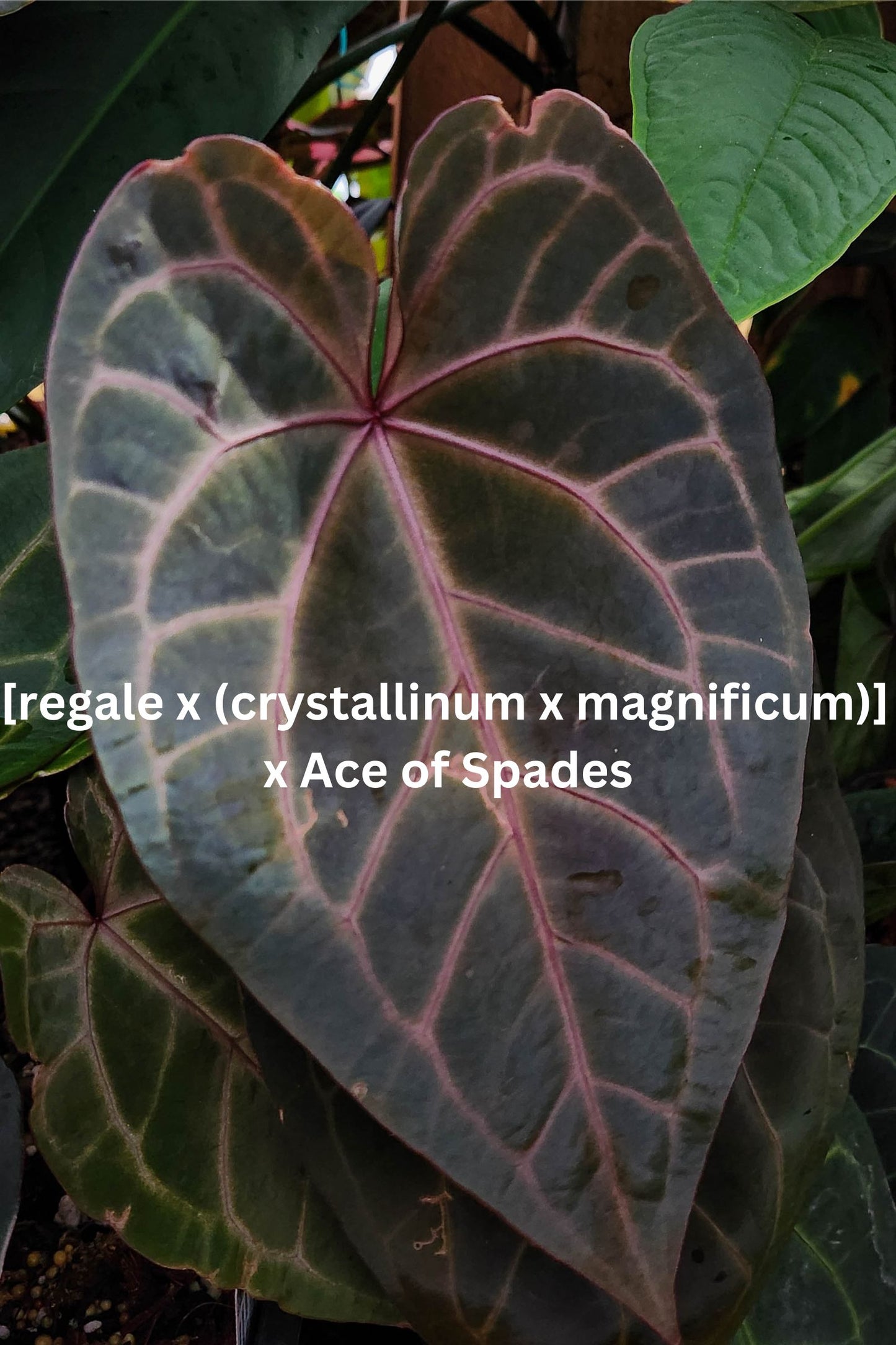 Anthurium 'Voss' is a complex hybrid with an enormous amount of potential, Anthurium {[regale x (crystallinum x magnificum)] x Ace of Spades} x (red crystallinum x magnificum). This female parent is equally is as dark as our darkest Ace of Spades with enhanced purple tones and the male parent is like a Red Crystallinum on steriods. These are bound to be incredible as they mature!