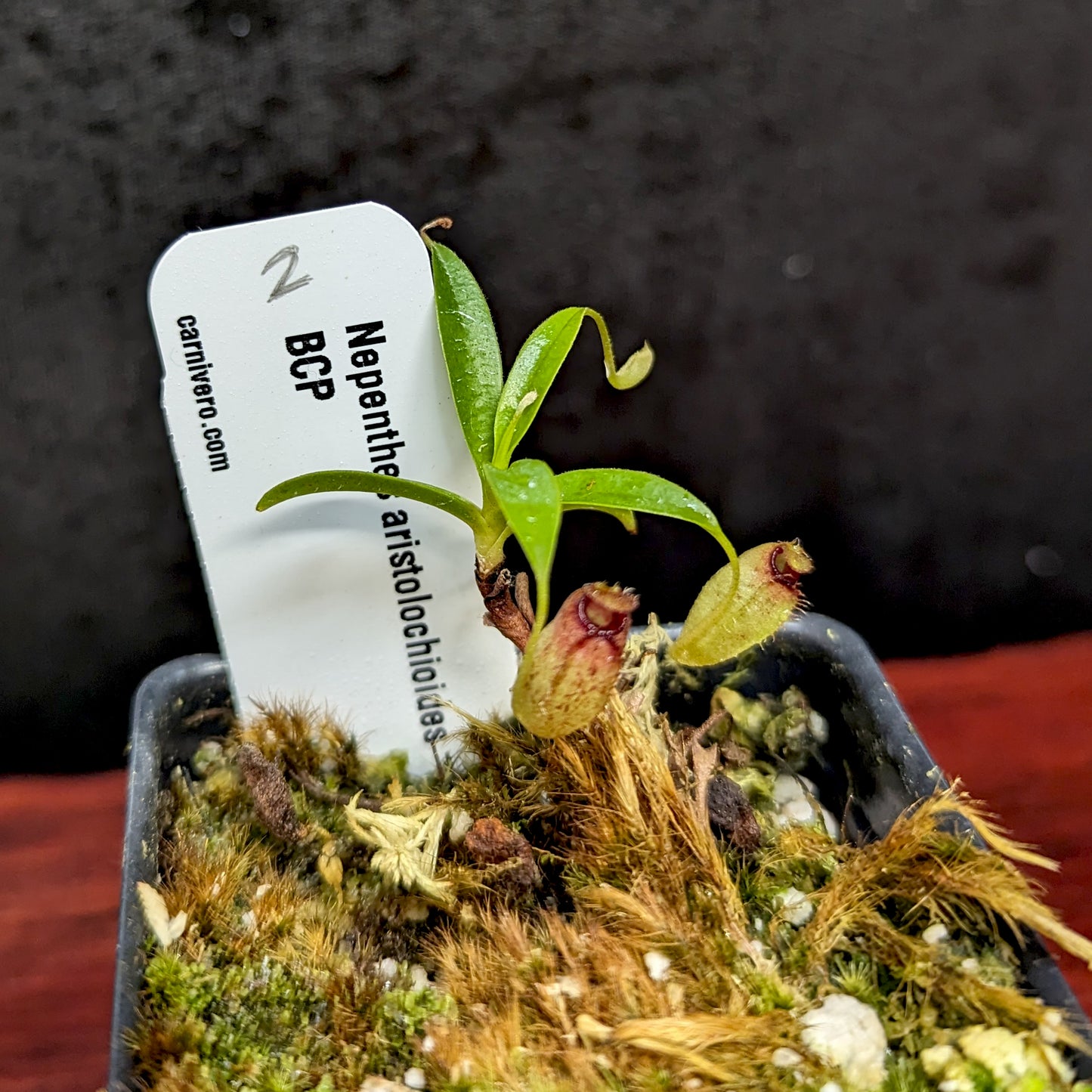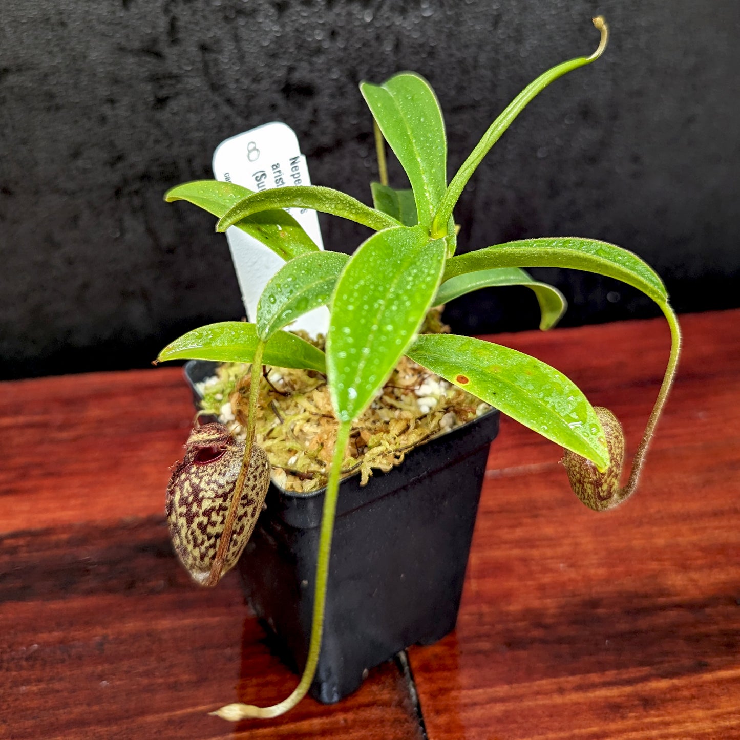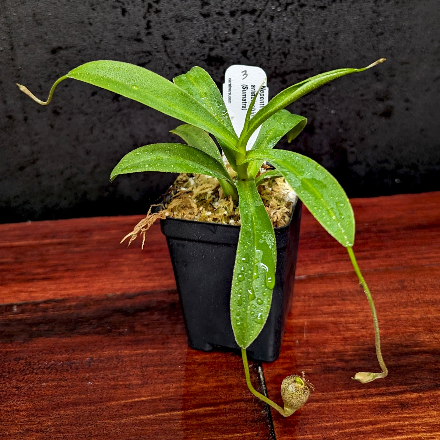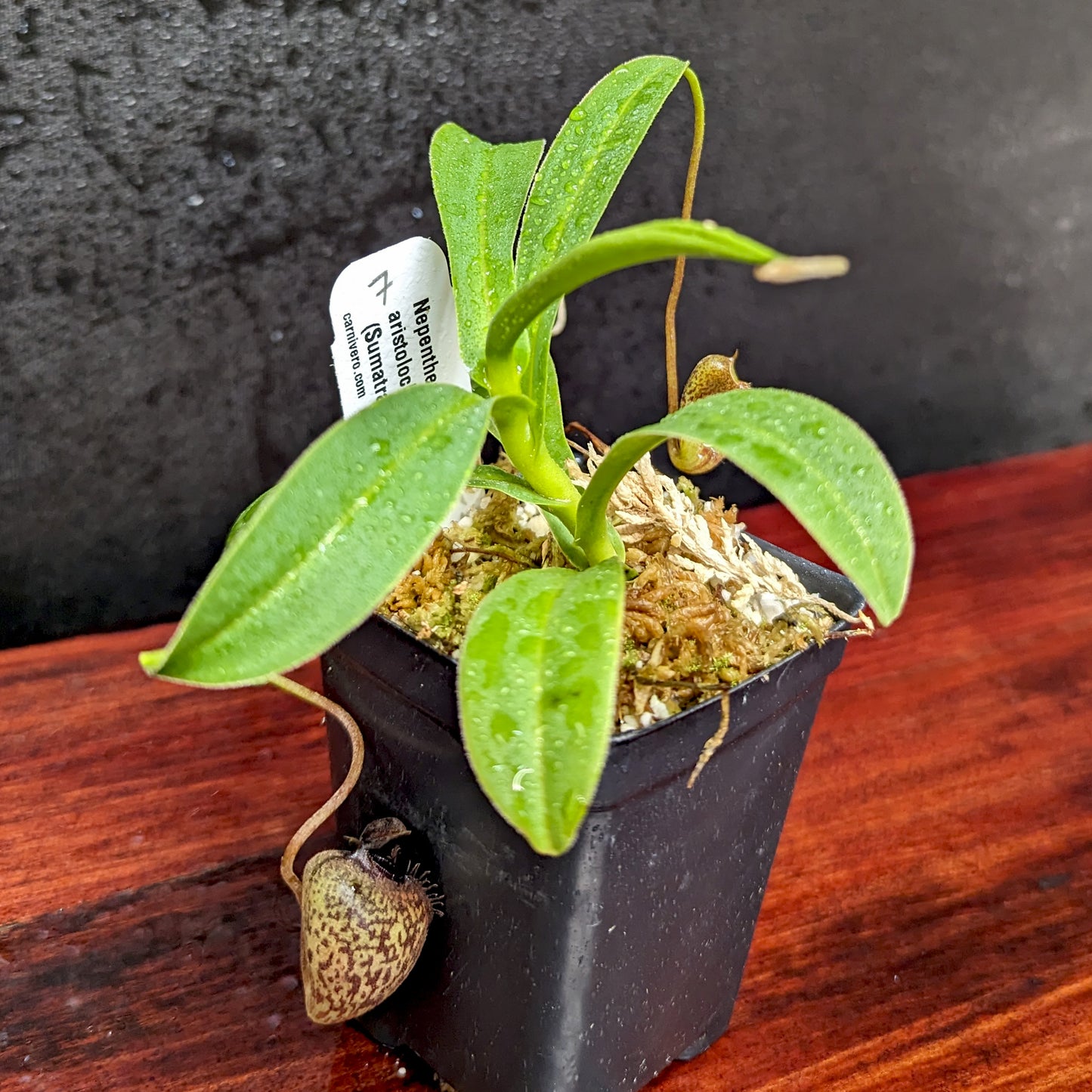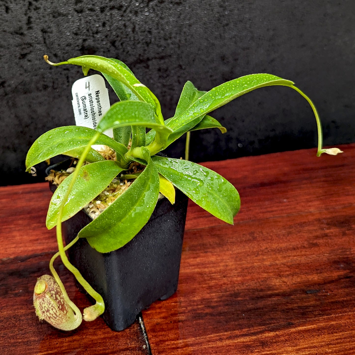 Nepenthes aristolochioides may be the most bizarre and unusual species in the genus. It produces richly colored pitchers with a vertical opening. The plant grows in the vicinity of Mount Kerinci near the west coast of Sumatra where it is highly endangered.