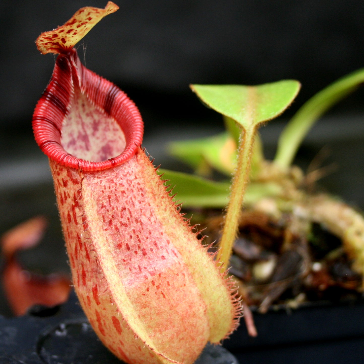 Nepenthes hamata x veitchii is an outstanding hybrid exhibiting great teeth and color. We have been pleasantly surprised by the range of orange/peach/red colors that the plants exhibit when their pitchers first open. Over time, these darken. We've found it to be tolerant of a wide range of growing conditions. Plants for sale are from Borneo Exotics, BE-3943 with the hamata parent being from the Tambusisi locale and the male parent being a Bareo veitchii.