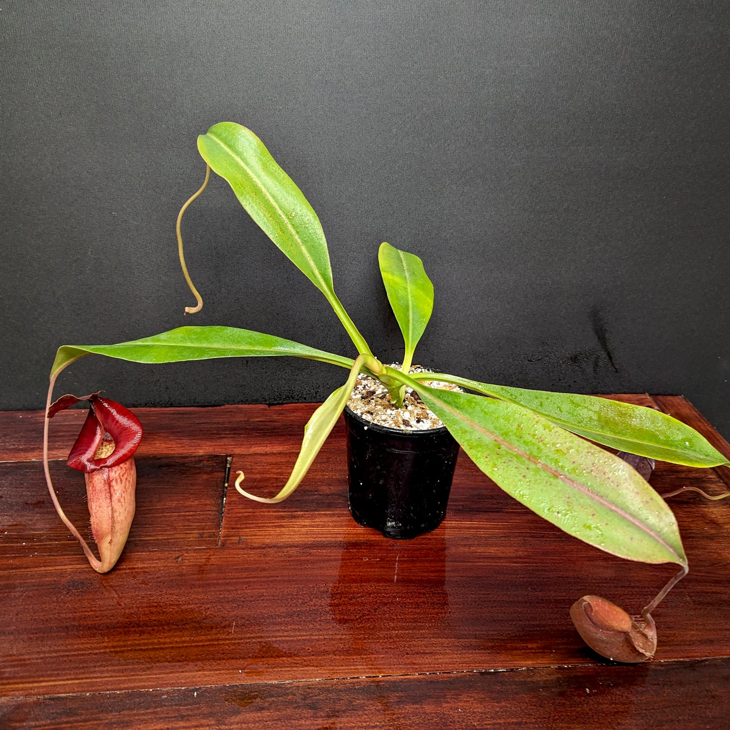 Song of Melancholy was of one Leilani Nepenthes's signature crosses and is believed to be Nepenthes boschiana x (spectabilis x veitchii). The male parent is our incredible Nepenthes spathulata x jacquelineae which is the best clone selected by Borneo Exotics for its deep cherry color, vigor and unparalleled peristome flare.