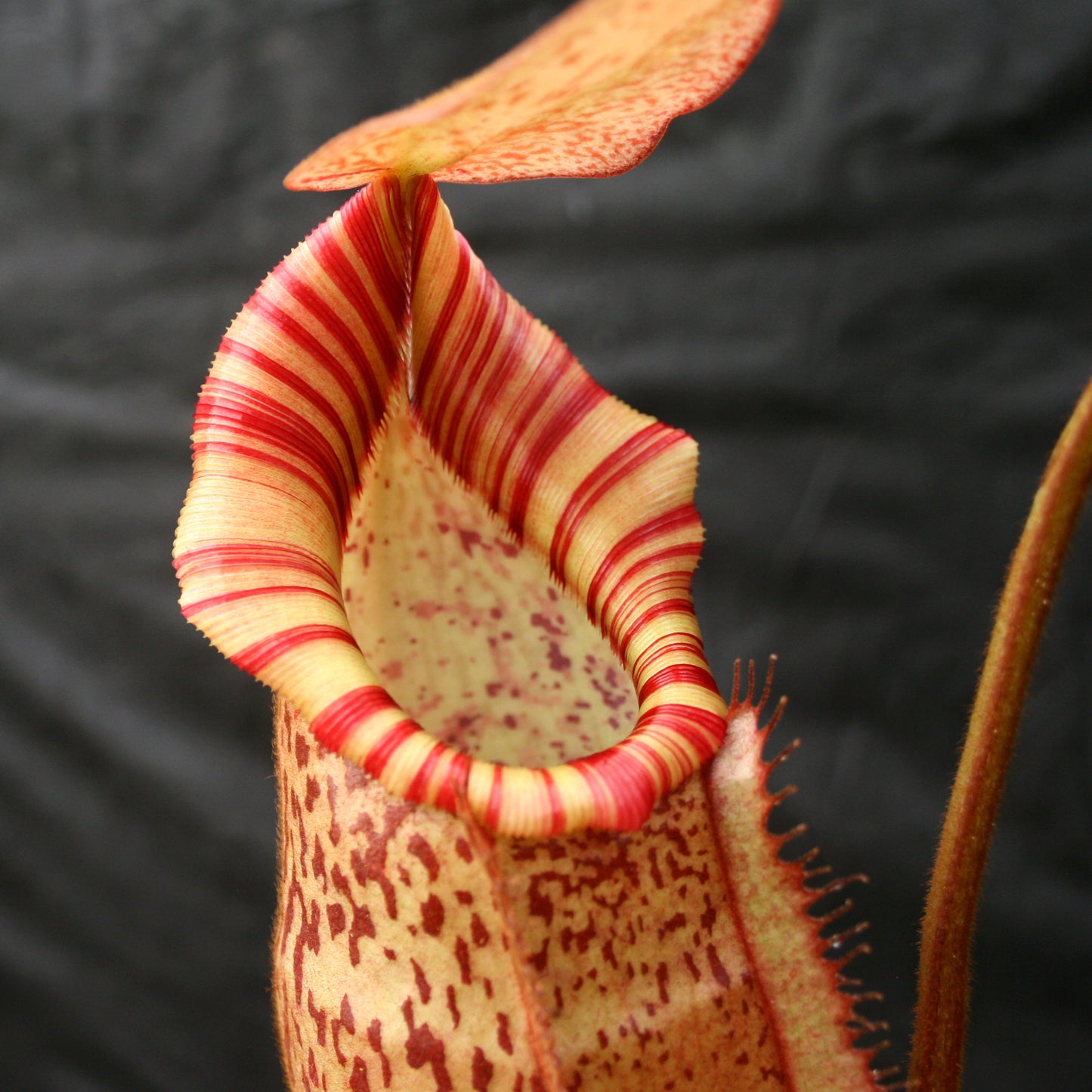 The female parent is the incredible Nepenthes spathulata x spectabilis "Giant" grown from seed by BE and selected as the best they have produced. The male parent is our stunning veitchii "Pink Candy Cane". The progeny so far are vigorous and seem to grow well under a wide range of conditions. We expect gorgeous colors and elaborately flared peristomes.