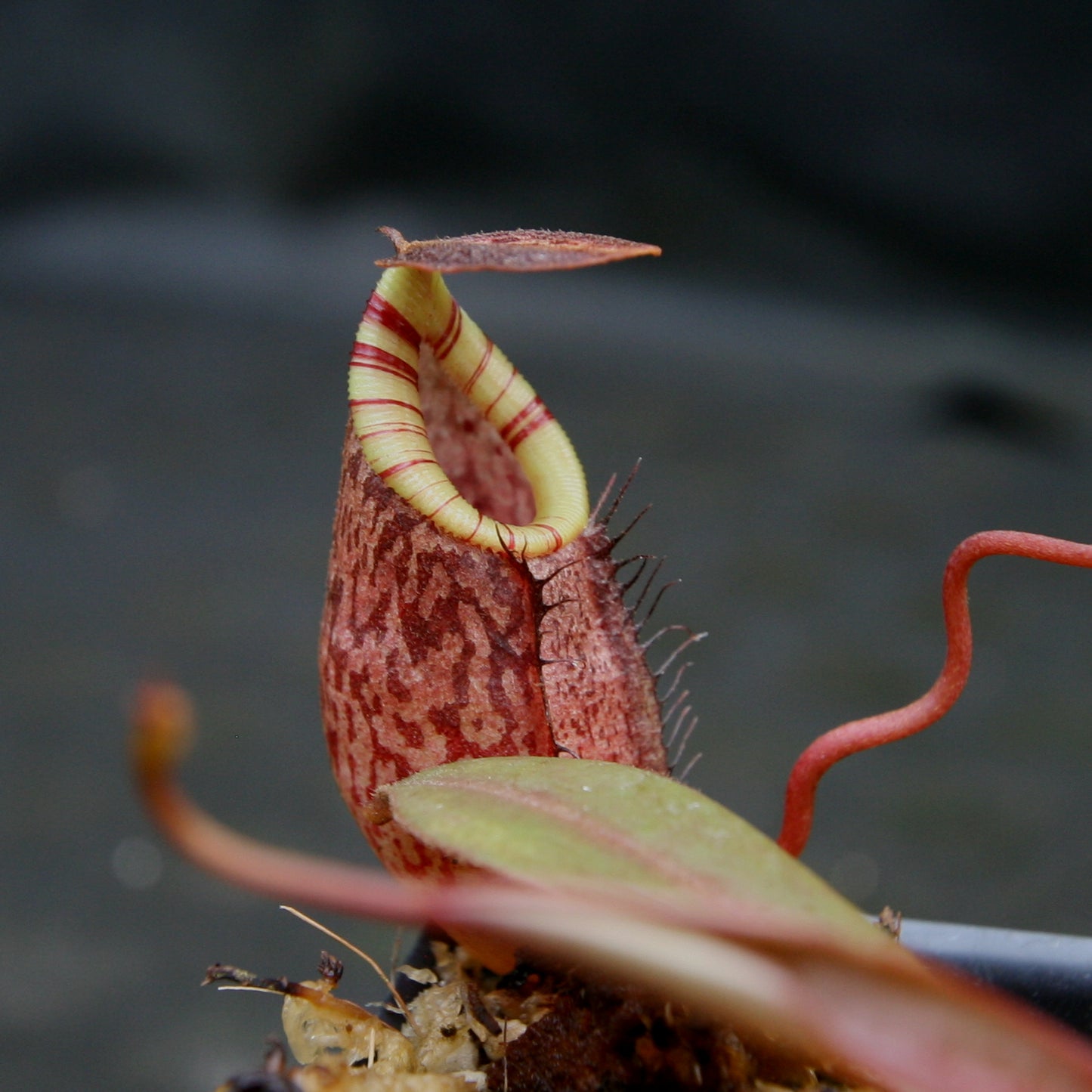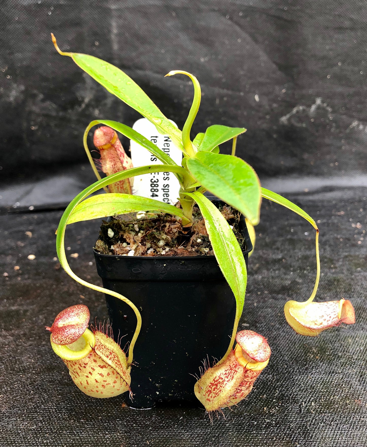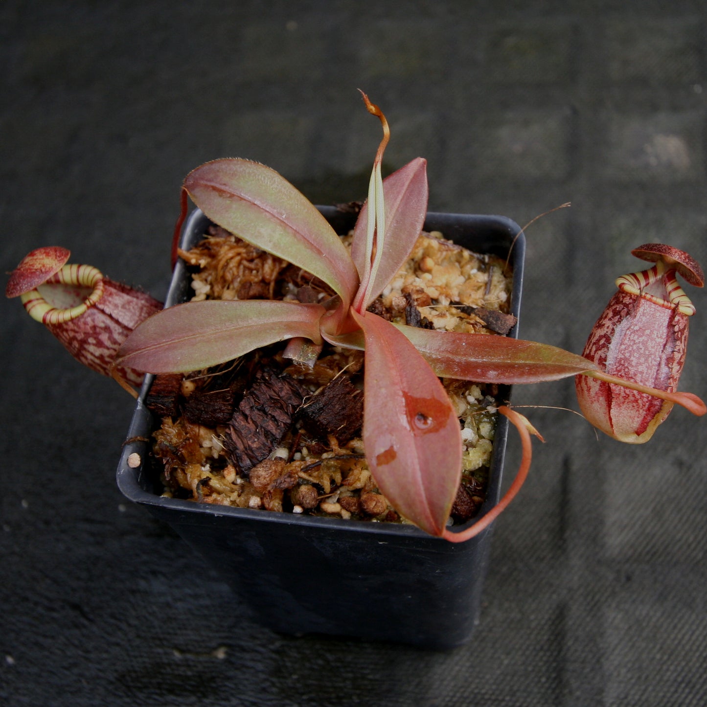 Nepenthes spectabilis x tenuis, BE-3884. A great combination between 2 awesome parents. Nepenthes tenuis tends to impart a very squat shape with a diminutive size while Nepenthes spectabilis hybrids are always colorful. Here, Borneo Exotics used one of their spectabilis Giant forms so the results should be even more spectacular.