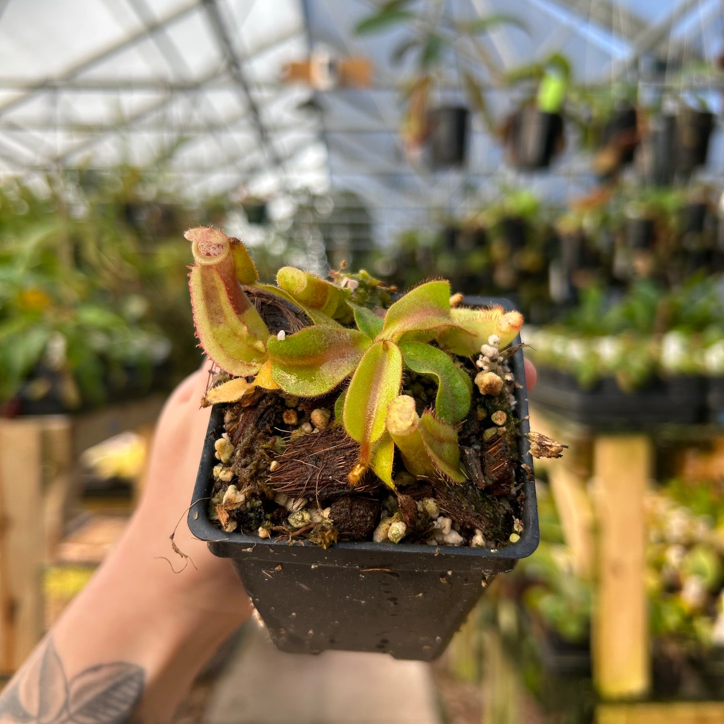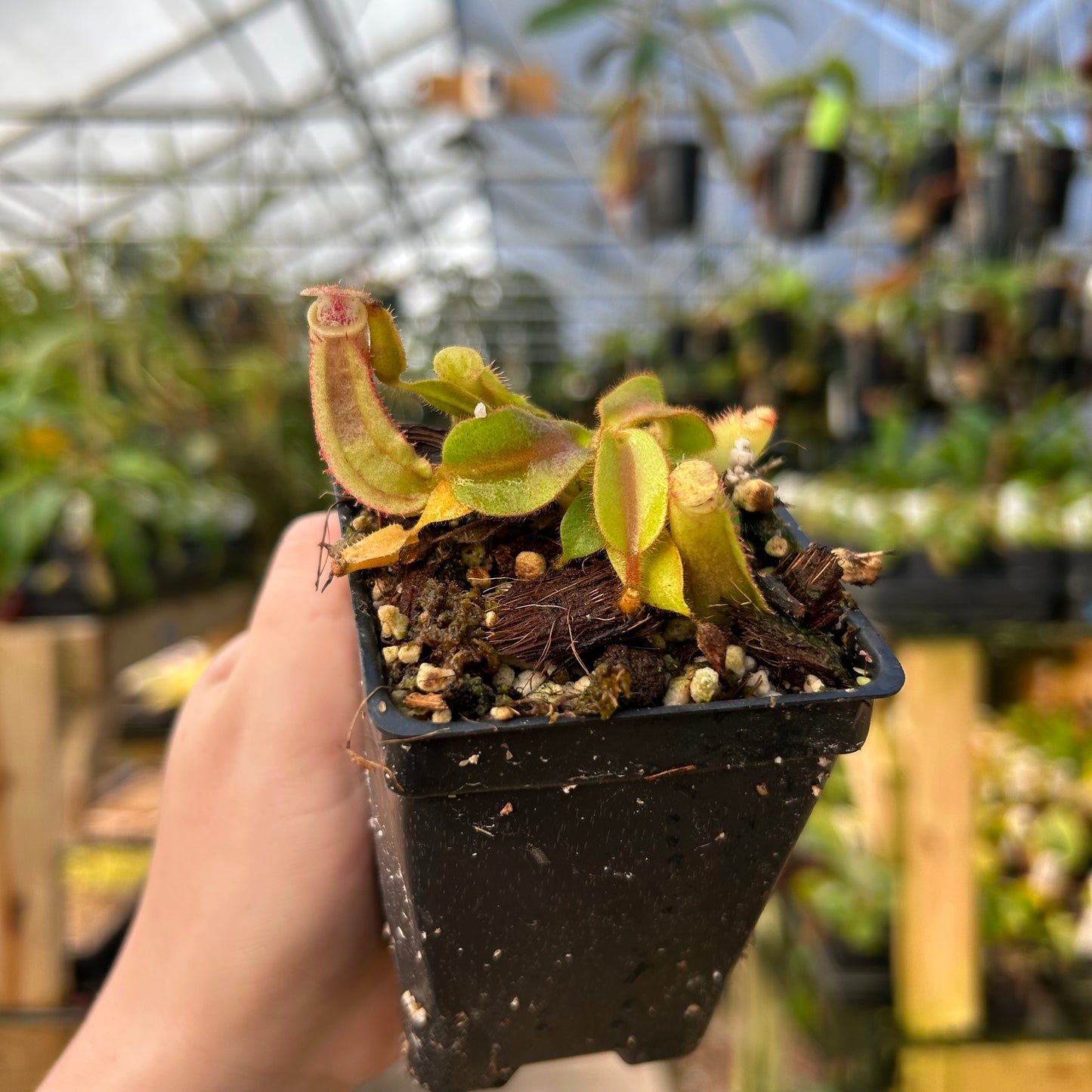 Nepenthes veitchii 'Big Mama' x bicalcarata combines two of the most well-known pitcher plant species. This monkeycup hybrid should show some incredible features. Extremely limited stock of this carnivorous plant for sale.