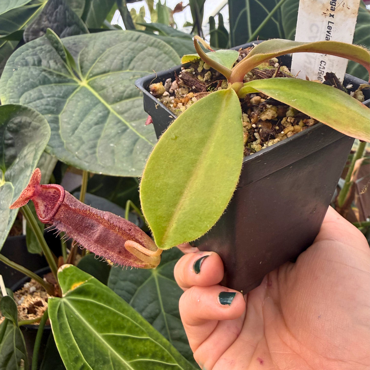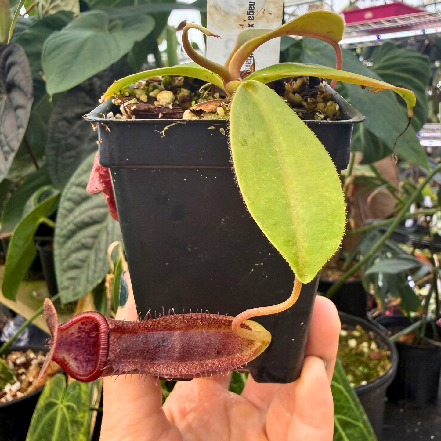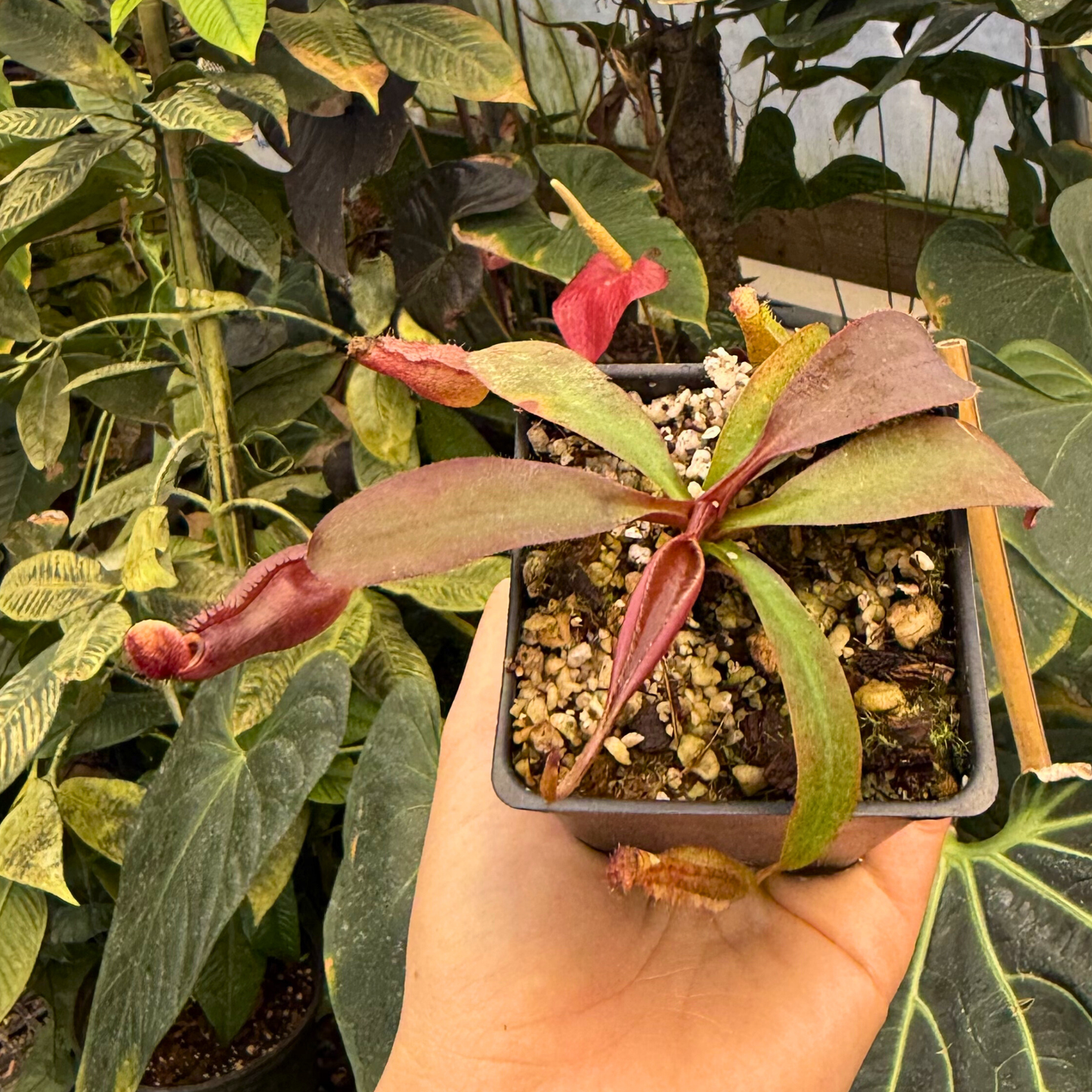 From N. naga 'Paul Barden', this cross inherits its deep coloration, dragon tongue lid appendage and huge size. The influence of N. x Leviathan (rajah x peltata) brings sheer size and pitchers with stout, powerful stature.