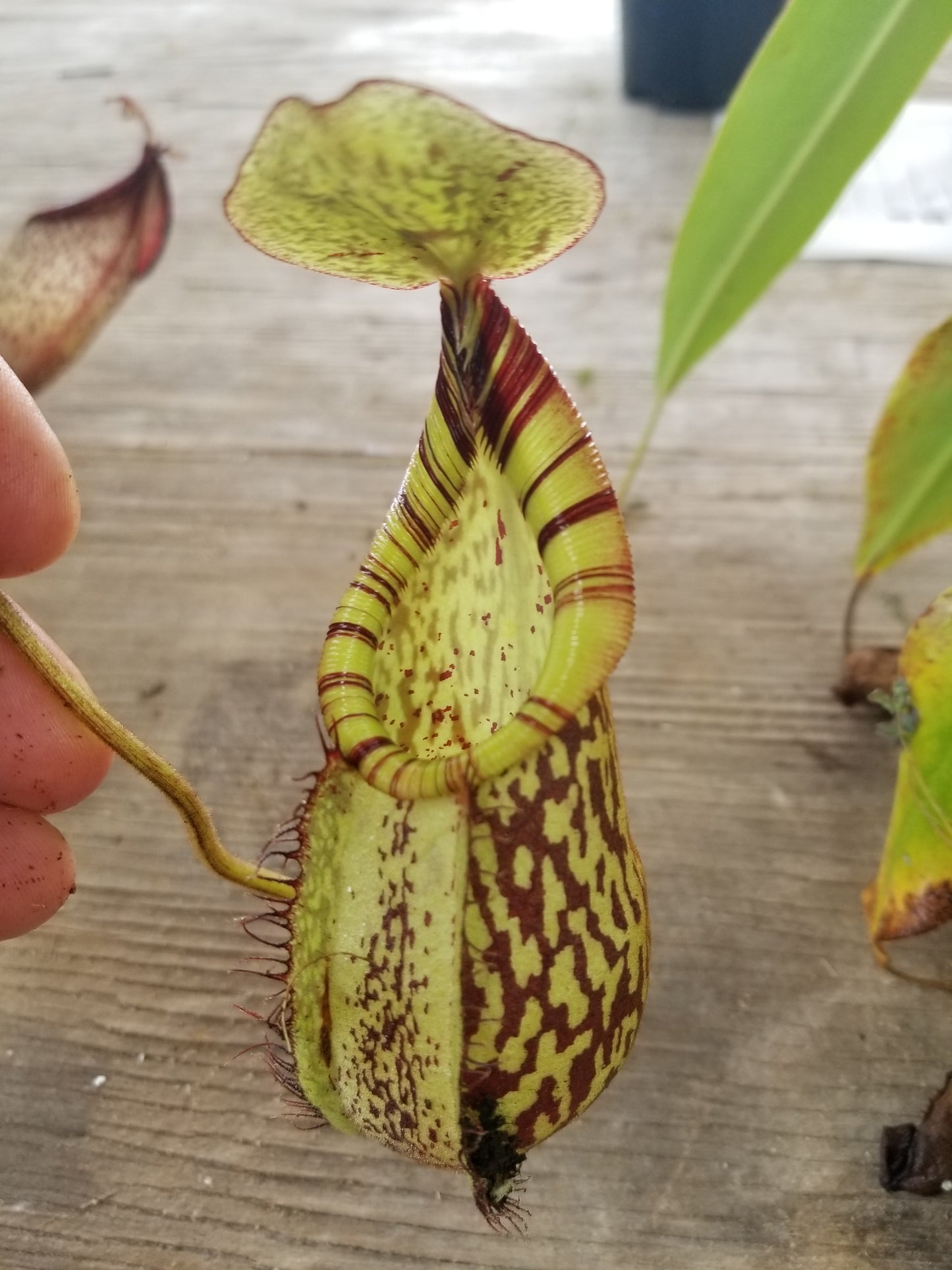 This cross has incredible potential. Both parents have some of the most superlative pitcher colors in the genus. We have seen larger specimens which exhibit bold striping along with the characteristic yellow/orange hue of mira hybrids. We've grown this hybrid in highland, intermediate and lowland conditions with great success.